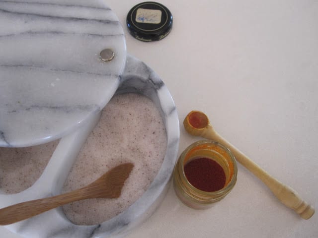 Thank you Joy and welcome! There is sea salt in the salt cellar. The little pink flecks are part of the salt. The little jar next to the salt is ground up saffron. Hope you enjoy the rice. Please let me know how it turns out!