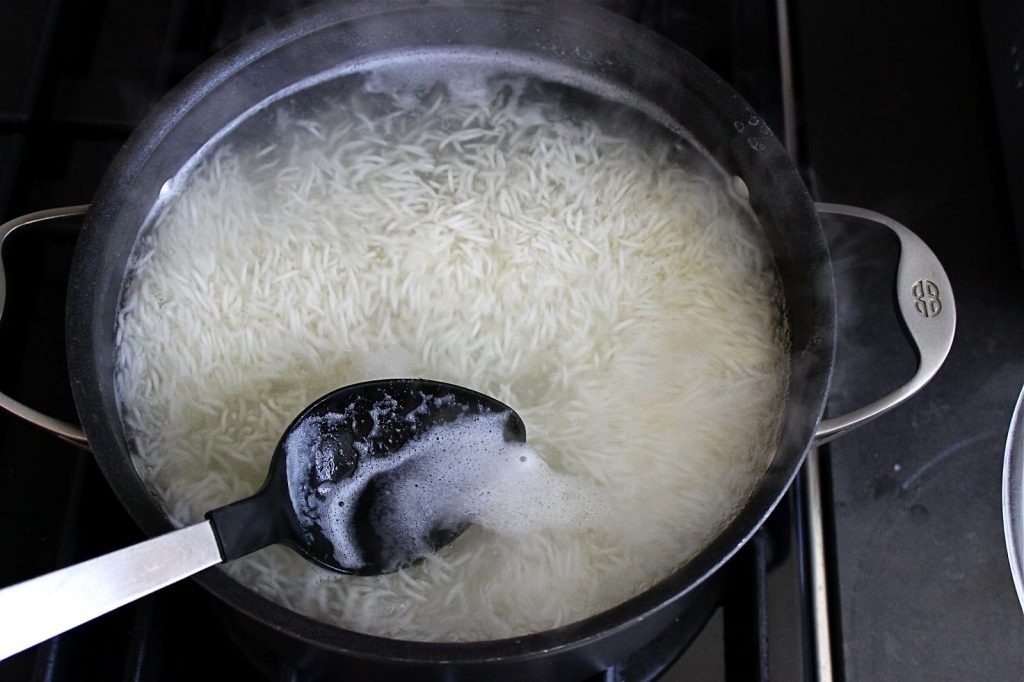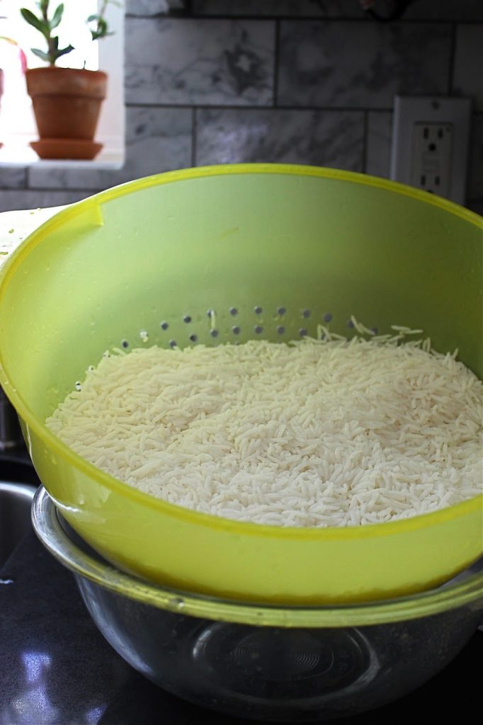 2- In a large pot bring 10 cups water and remaining 3 tablespoons of salt to a boil.  Drain soaked rice.  Add the rice to the boiling water and bring back up to a boil.  Leave pot uncovered and don’t go anywhere!  The water can boil over very easily. With a spoon scoop off any foam that rises to the top. Watch your timer.  Start testing your rice after 4 minutes.  My rice was al-dente and ready to drain at 5 minutes.  It shouldn’t take longer than 6-8 minutes.  Once al-dente, drain in a colander and quickly rinse the rice under warm water.  Make sure your colander’s holes are small enough so you don’t lose any rice. When rinsing the rice under warm water make sure you don’t open a gushing amount of water on the rice.  If your faucet has a spray option use that.  If not place your hand under the tap and with fingers create a spray.  Gentle.  Let rice completely drain off any excess water.