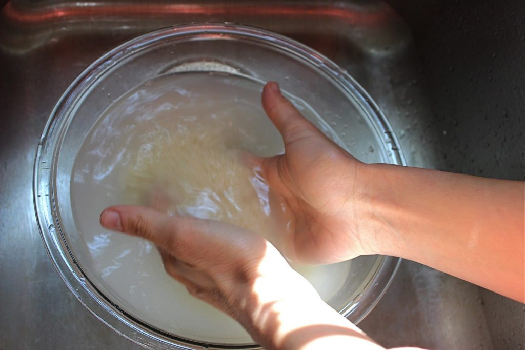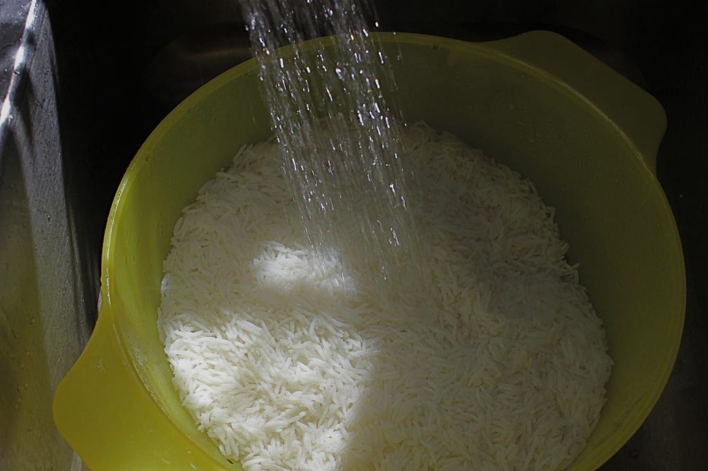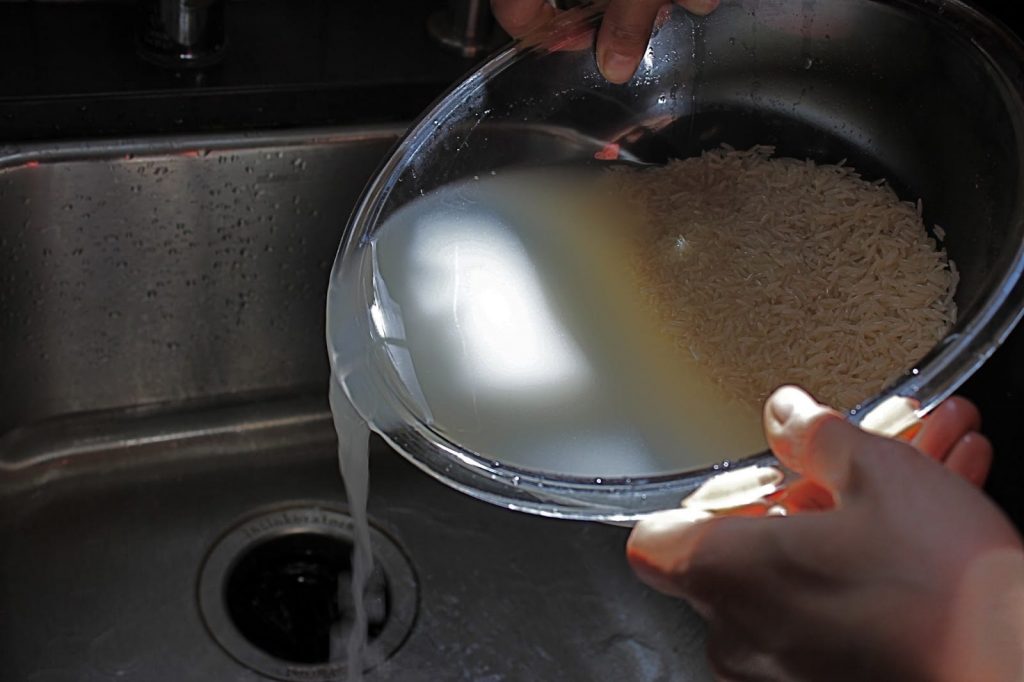 1- Place rice in a medium sized mixing bowl.  Fill with cold water.  Wash rice in water by gently swirling the rice around in the water.  Drain and repeat process about 5 times.  Until the water that is rinsed runs clear, not cloudy.  Soak washed rice in 2 cups cold water and 2 tablespoons salt for at least 1 hour.