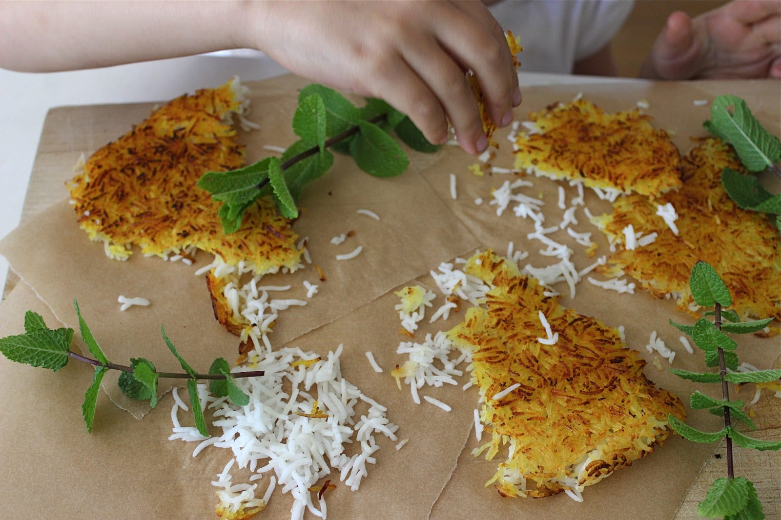 First it’s the triumphant sound of success, the swish sound of the release, as the rice drops from pot to dish.  I gently pull the pot up and away and there she is in all her glory – golden and regal  – TAHDIG.  Merrymaking ensues.  Exhale.  The Muse of Cooking decided to smile upon me  – this time.