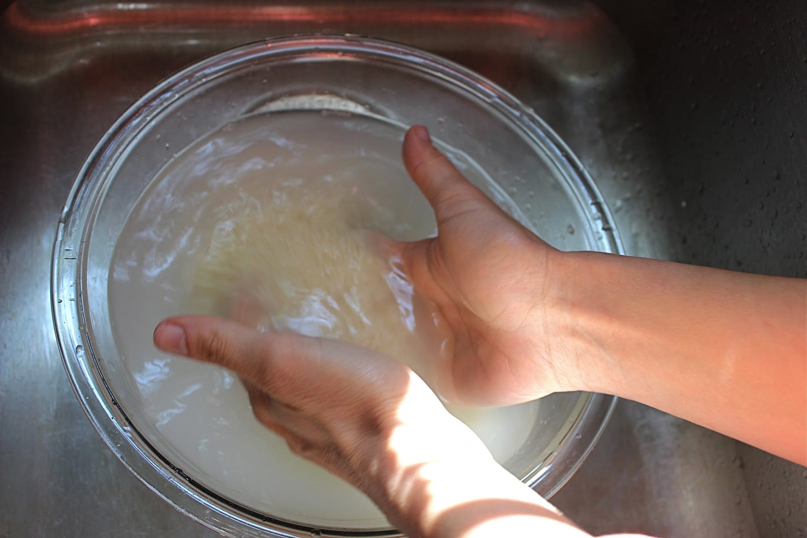 1- Place rice in a medium sized mixing bowl.  Fill with cold water.  Wash rice in water by gently swirling the rice around in the water.  Drain and repeat process about 5 times.  Until the water that is rinsed runs clear, not cloudy.  Soak washed rice in 2 cups cold water and 2 tablespoons salt for at least 1 hour.