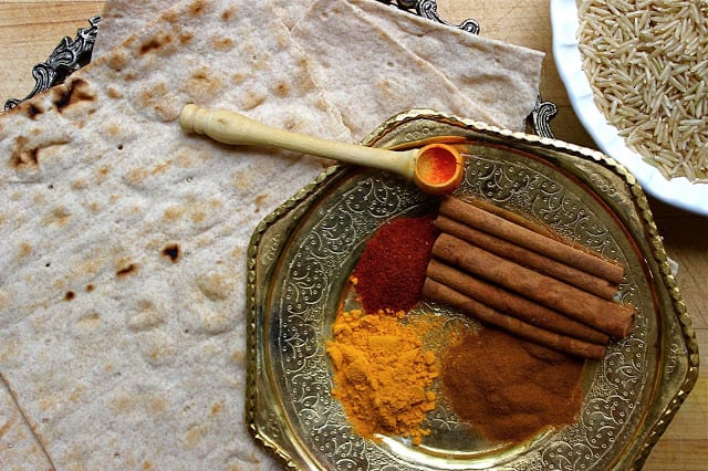 The preparation of the bread tahdig is very similar to that of a rice tahdig. I used bread here for variety and because the girls happened to ask for it. Some days Luna prefers bread tahdig and Soleil prefers rice tahdig. The challenge is to get them to agree to the same kind of tahdig on the same day. Typically we use lavash bread – which is like a thin Middle Eastern style flat bread. On this particular day I used a whole wheat lavash from Trader Joe’s. I simply tear fairly large pieces and place them on the bottom of the pot. Then I patch up any open spaces with smaller pieces. Make sure the sides of your pot are well-greased to avoid the bread sticking to the sides of the pot. Bread tahdig can burn very quickly so really keep a nose on this one and use a heat diffuser for the rice steaming part to ensure no burning of the bread. I use an old toaster oven metal rack insert as my heat diffuser.