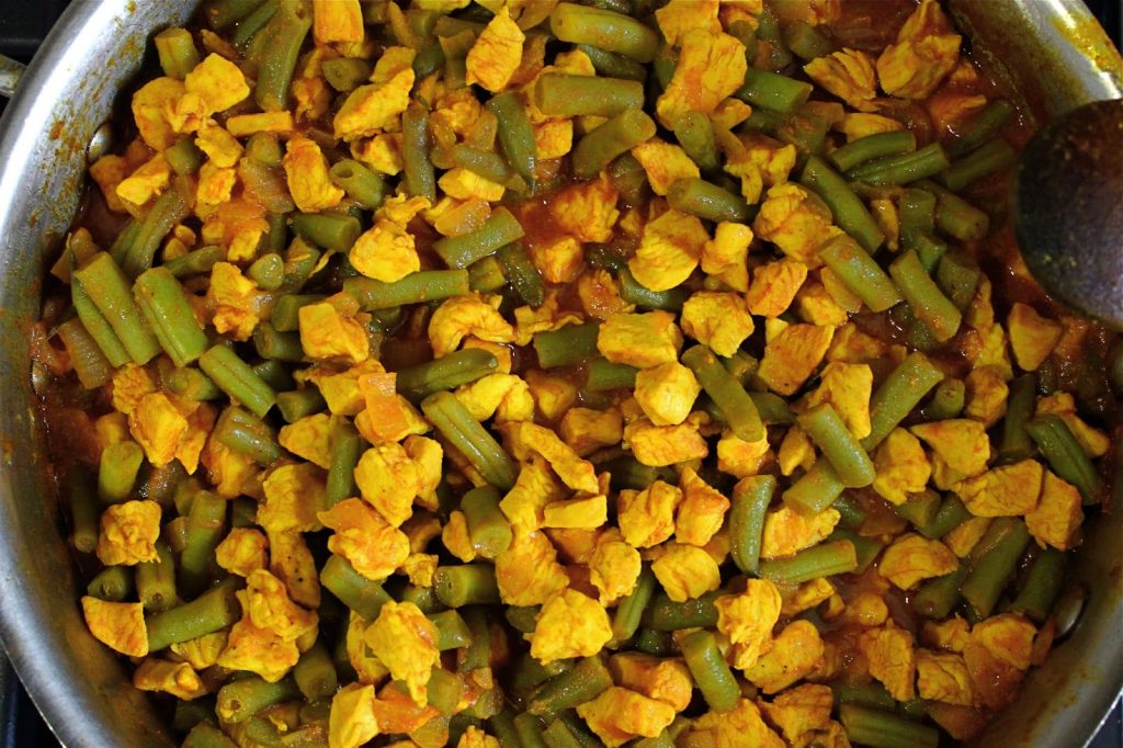 - Add saffron water, tomato paste water, and lemon juice. Stir to combine. Turn heat down to medium low and simmer uncovered for 20 minutes, stirring occassionally until chicken has cooked through and green beans have softened, but not mushy. Adjust seasoning and add more lemon juice if necessary.