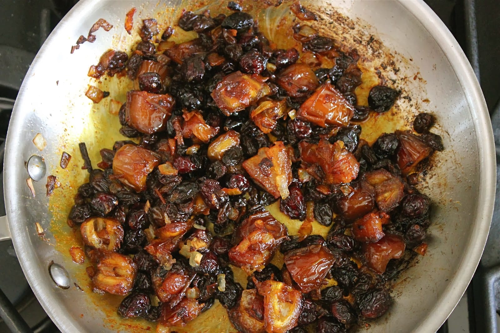 Adas polo literally means lentils and rice. It is a very common, everyday dish typically served with a fried, or hard-boiled egg. I think a poached egg would also be great. Ultimate comfort food. It has also taken on the role of the side dish to serve for Thanksgiving in many Persian homes. The addition of the dates, raisins, cranberries and a hint of cinnamon sprinkled in the rice give it a beautiful festive autumnal appeal and add just the right amount of sweetness and texture. It is also a great vegetarian alternative. Typically, adas polo is prepared with tahdig in mind. Which means you would go through the two step method of preparing the rice. First parboiling the rice and also cooking your lentils separately until they’re al-dente. Then steaming the two together until everything is cooked through and you have crunchy golden tahdig. You also have the option of adding the dried fruits mixture to the steaming process or simply scattering them on top of your rice when serving – as I have done here. But if you don’t want to make tahdig you can prepare your basmati rice (white or brown) as you like, cook your lentils completely through separately, prepare the dried fruits mixture and mix them all together at the very end when serving. But you know I’m going to urge you all to try and make tahdig. And actually, steaming the rice and lentils together wonderfully melds all the flavors.