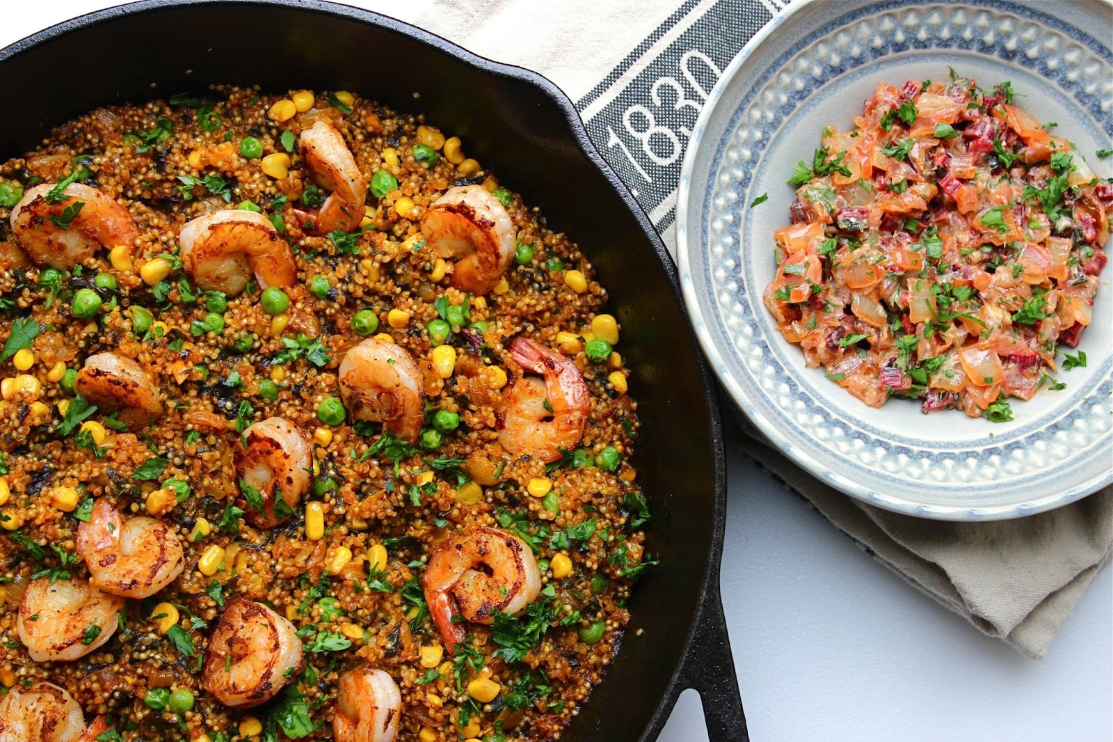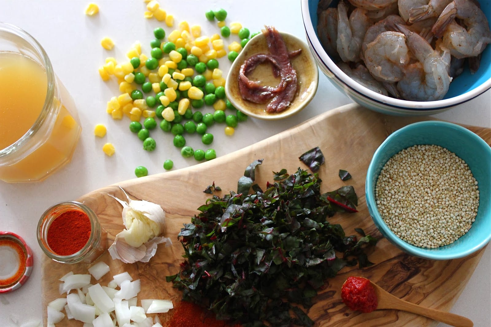 This dish is inspired by the traditional Spanish paella. The best part about it is that it can essentially be made with whatever you have on hand and can be prepared fairly quickly. I usually get a lot of help from my freezer goods. You can use chicken, other types of seafood, sausage, crack an egg on top, or keep it vegetarian (I’m dreaming of mushrooms, asparagus..you get the picture). I usually have a bag of frozen shrimp saved for those last-minute meals. And as is the case with all our seafood consumption, I always make sure to check in with Seafood Watch. They also have a great app which is very helpful when you’re at the seafood counter and not sure about the quality, safety and sustainability of what you’re about to purchase. Our other freezer staples are bags of frozen peas and corn. Perfect for the makings of a paella. Whenever possible I also try to sneak in our dark leafy greens like the chard here but you could also use kale or spinach. The trick here is to finely chop up the greens or cut them into thin ribbons so they get well-incorporated into the dish; also ensuring no complaints from the little ones. I don’t use the chard stalks in the paella but instead quickly saute them up in olive oil with some chopped onion, garlic and lemon zest. Then stir in a little yogurt, a hit of parsley and enjoy it as a salsa alongside the paella. This also makes a great dip you can serve with grilled or sauteed shrimp.