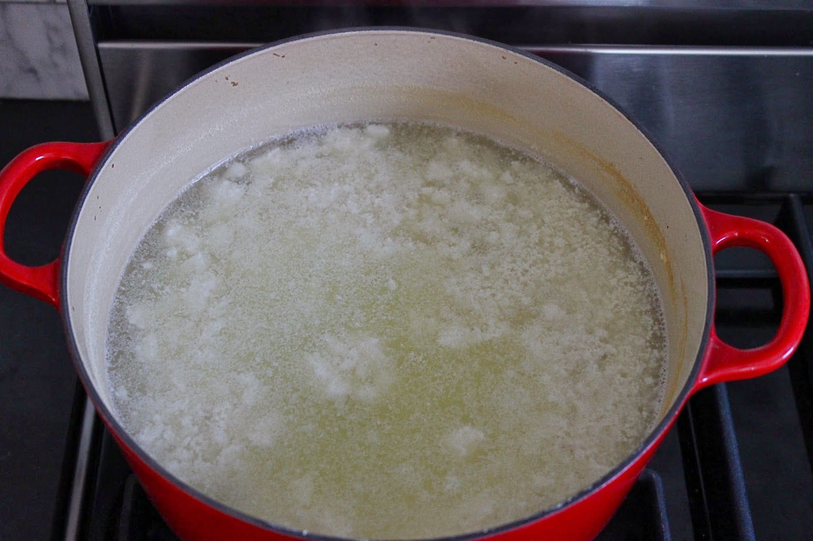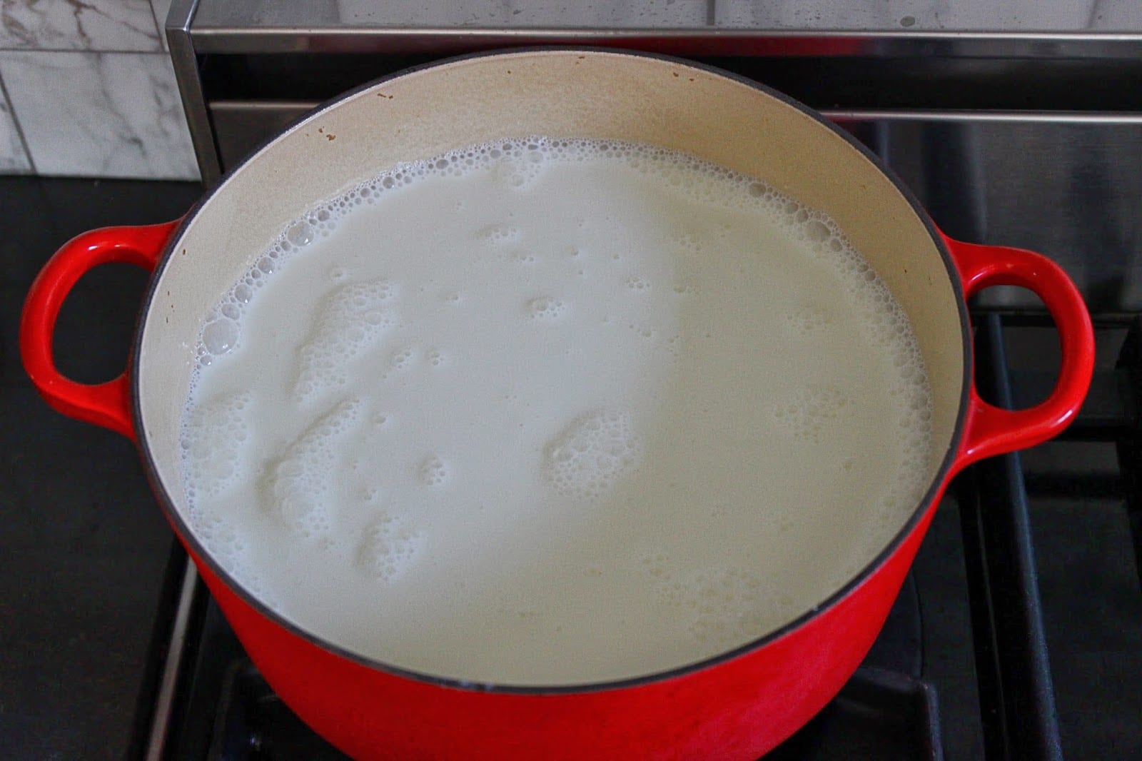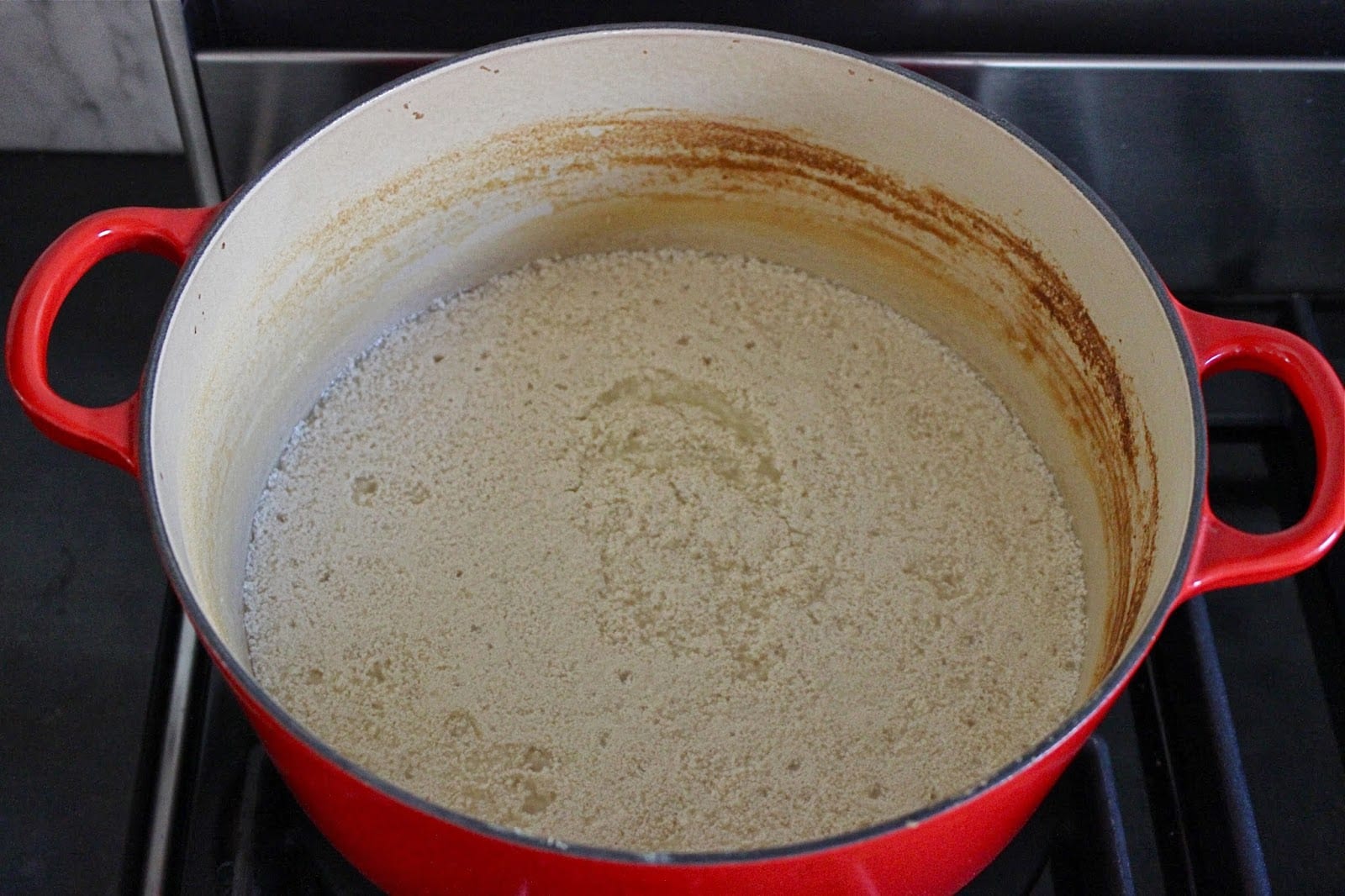 1- Place the yogurt from both containers in a large pot over medium heat. Fill the empty containers up with water and add to the yogurt. Stir and bring to a gentle boil. Turn down the heat slightly and let the mixture simmer for about 2 1/2 hours or until all the water evaporates and you are left with a pulp like ingredient. Stir once in a while to make sure nothing is sticking to the bottom of your pot or burning. Through this process the yogurt will separate and break down. This is normal. The color of the yogurt will also turn from creamy white to a pale beige. There will also be a distinct tart smell.