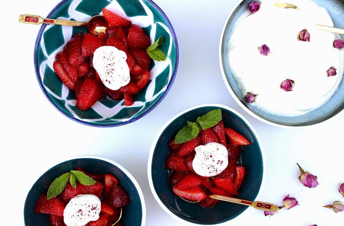 STRAWBERRIES MACERATED IN POMEGRANATE MOLASSES WITH ROSE WATER CREAM