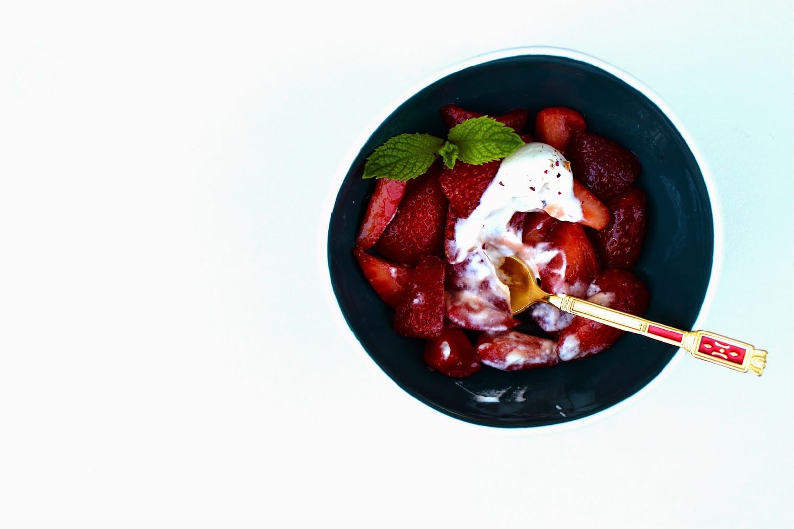3- Serve the strawberries and their juices in a bowl with a dollop of rose water cream.  Garnish with a dusting of ground up dried rose petals and a couple of mint leaves.  Enjoy right away.  The strawberries are also fantastic over Greek yogurt or on your morning pancakes and waffles!