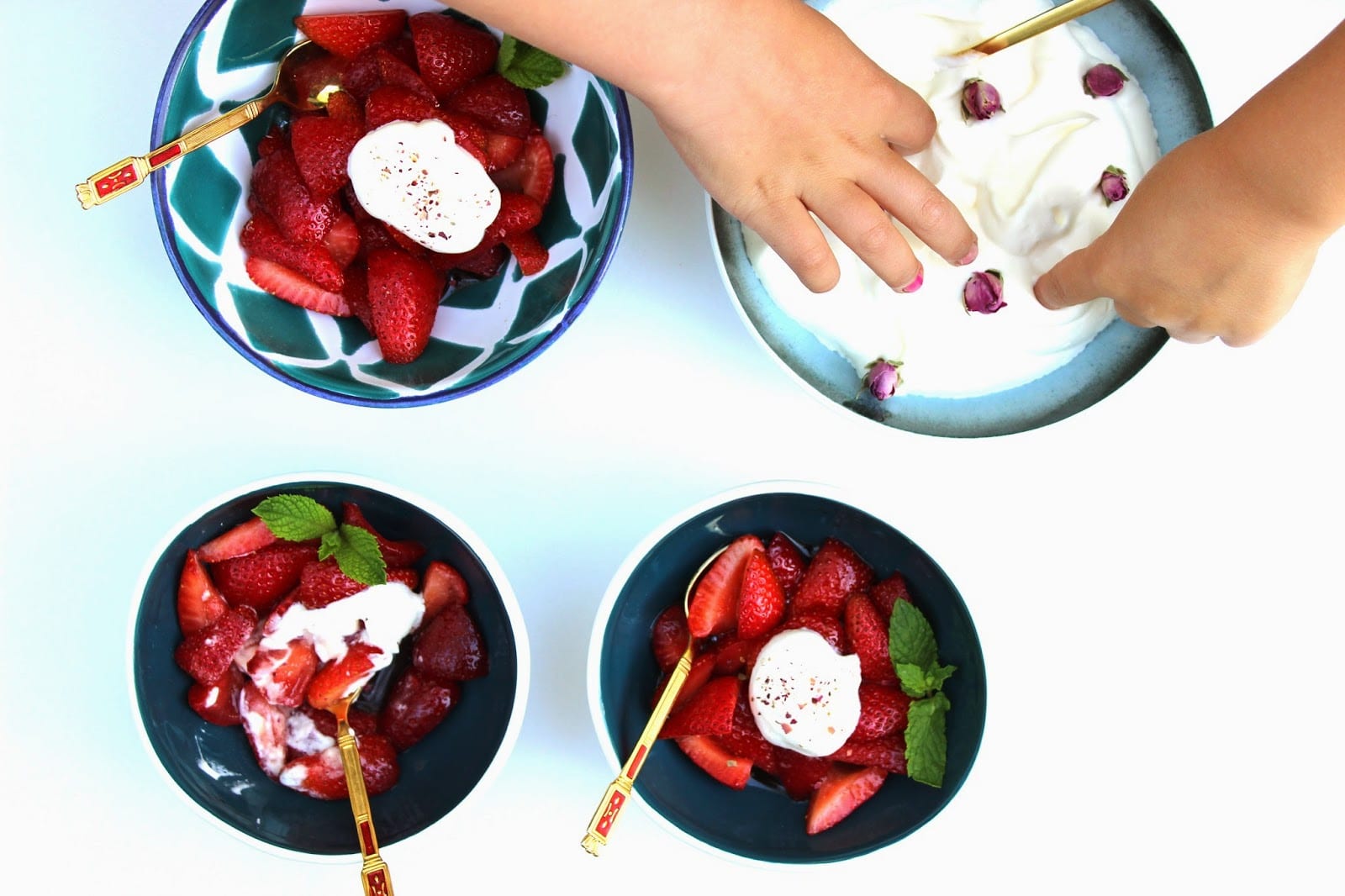 Mothers and Daughters – Strawberries Macerated in Pomegranate Molasses with Rose Water Cream