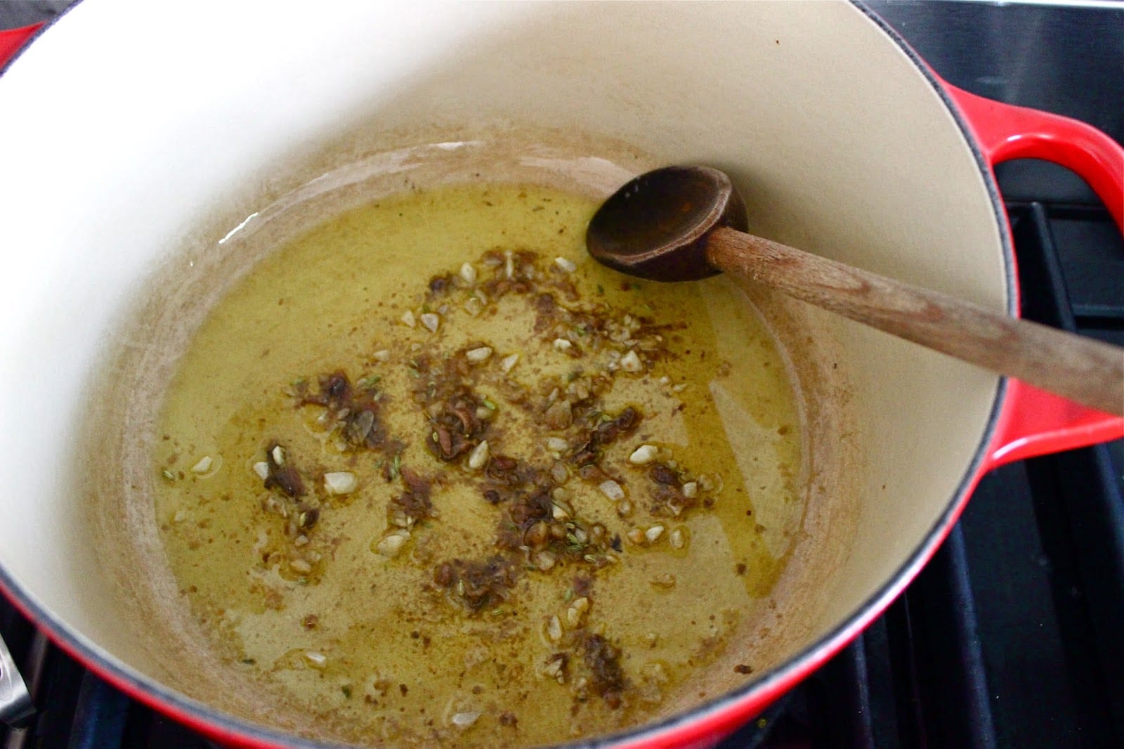 1- Heat the olive oil in a large pot over medium/low heat.  Add the garlic and anchovies.  Add the fennel seeds by crushing them between your hands.  Stir and cook until the anchovies start breaking down and melting into the oil.  Take care not to burn the garlic, turn heat down if necessary.  3-4 minutes.