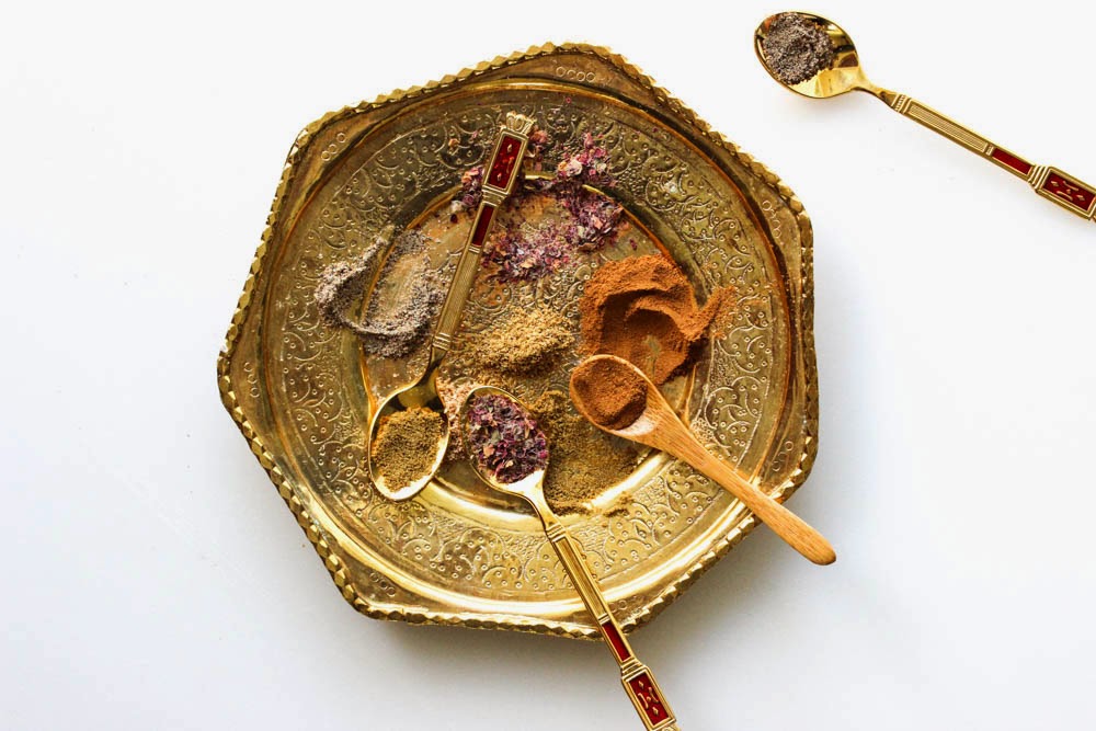 Saffron, turmeric, cinnamon, rose petals, cardamom, golpar, my advieh jar,  salt – my dear, dear, companions.