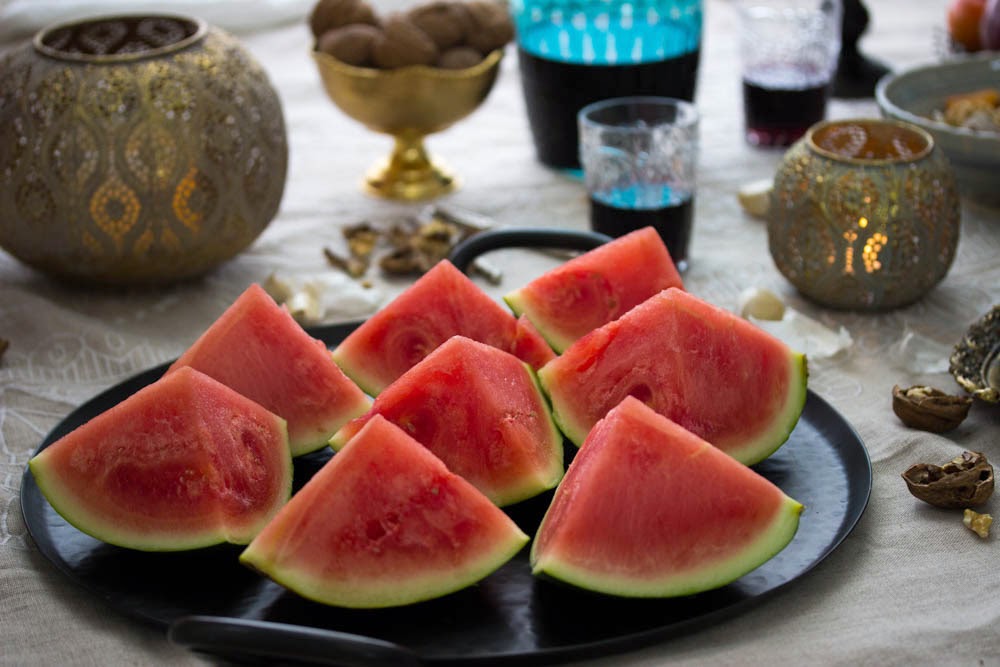 Set the Yalda table.  A study in various shades of red. All to symbolize a crimson dawn – the light of life. Watermelon for protection against excess heat in the summer months. Pomegranates and red pears to ward off insect bites.