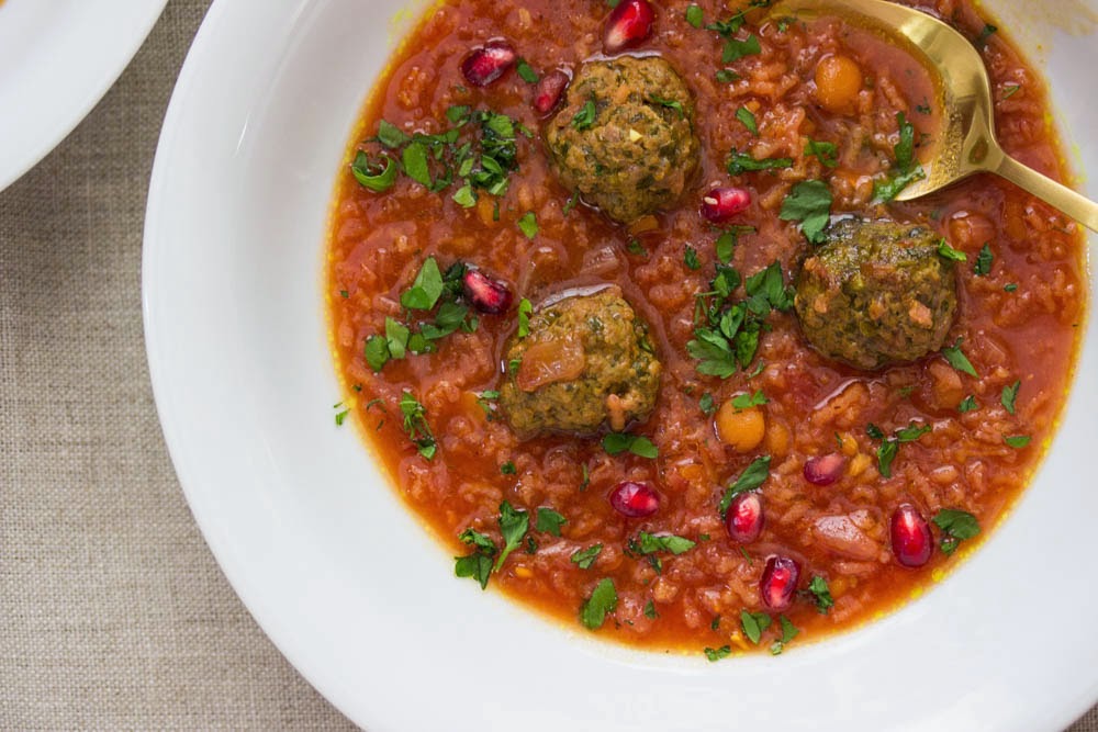 Gently drop the meatballs in the pot. Grate the beet and let its juices drip through your fingers and into the aash.  Chalk it up to more good luck. Hold the bottle of pomegranate molasses high above your caldron as you release its contents. Stir, stir and stir some more, then cover.