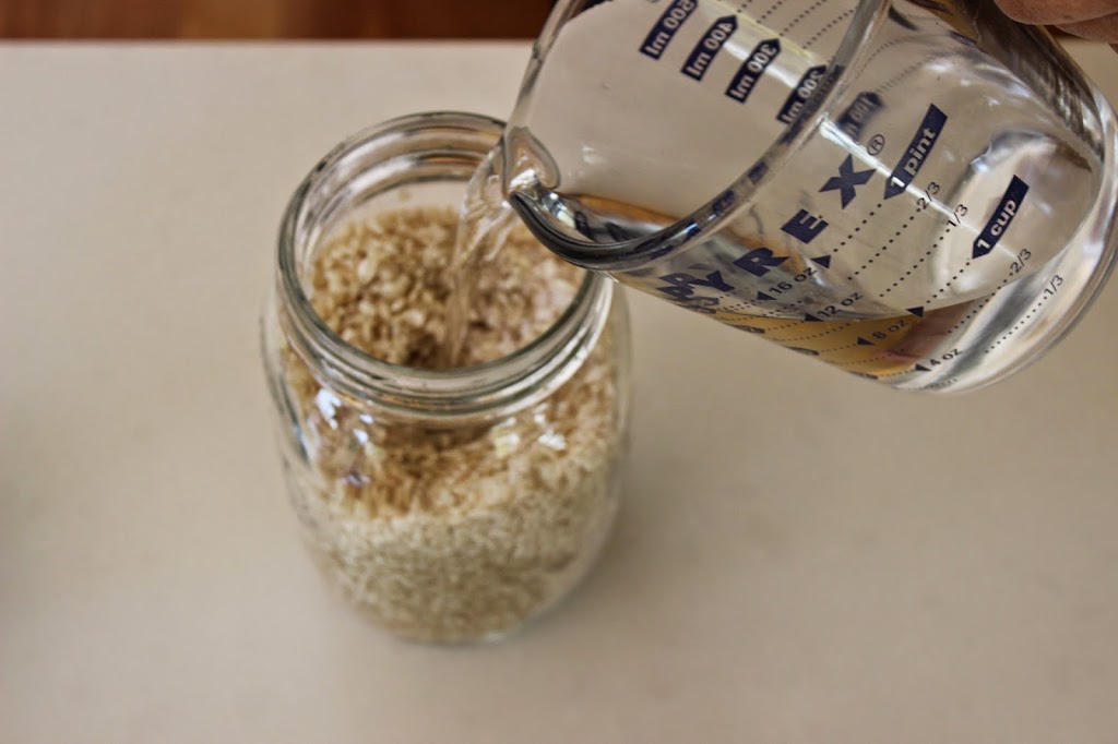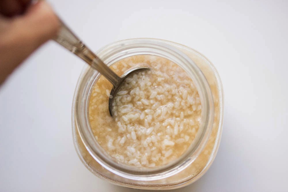 Using a spoon, transfer the rice koji/sea salt to a sterilized 1 liter glass jar and add 500ml water. Make sure there is enough water to fully cover the surface of the koji.