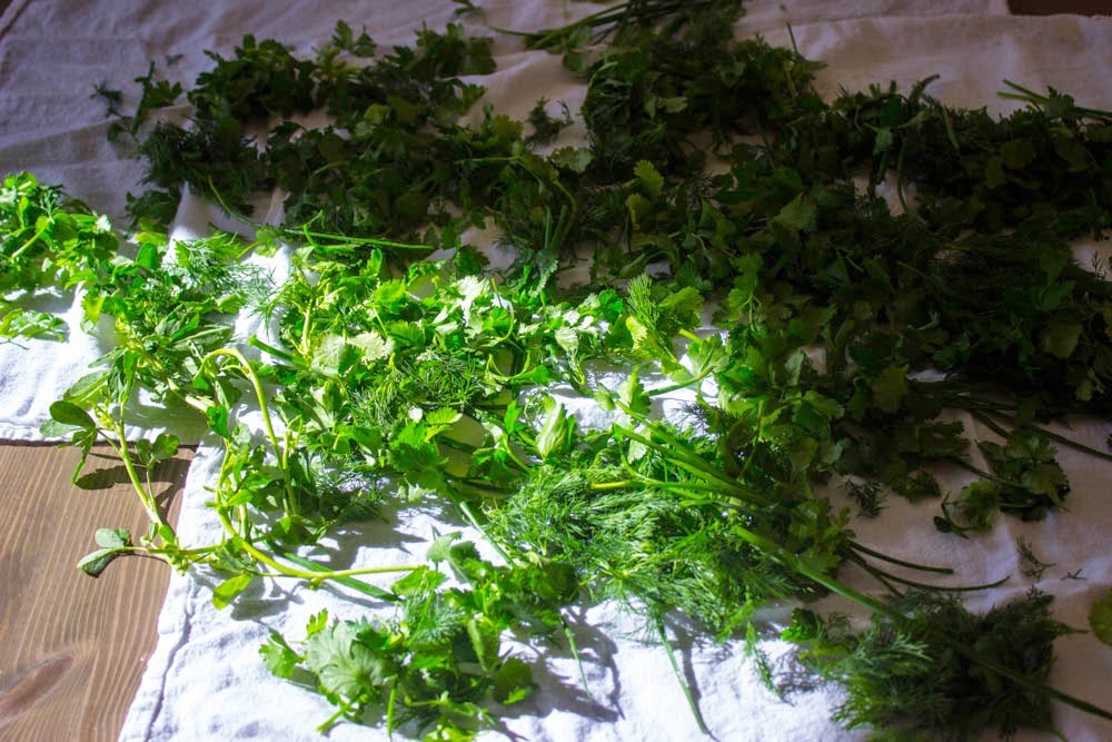 You quickly lay out fresh towels.  And she patiently scatters the herbs across it to dry.  A field of greens on your kitchen table.  A most familiar sight.