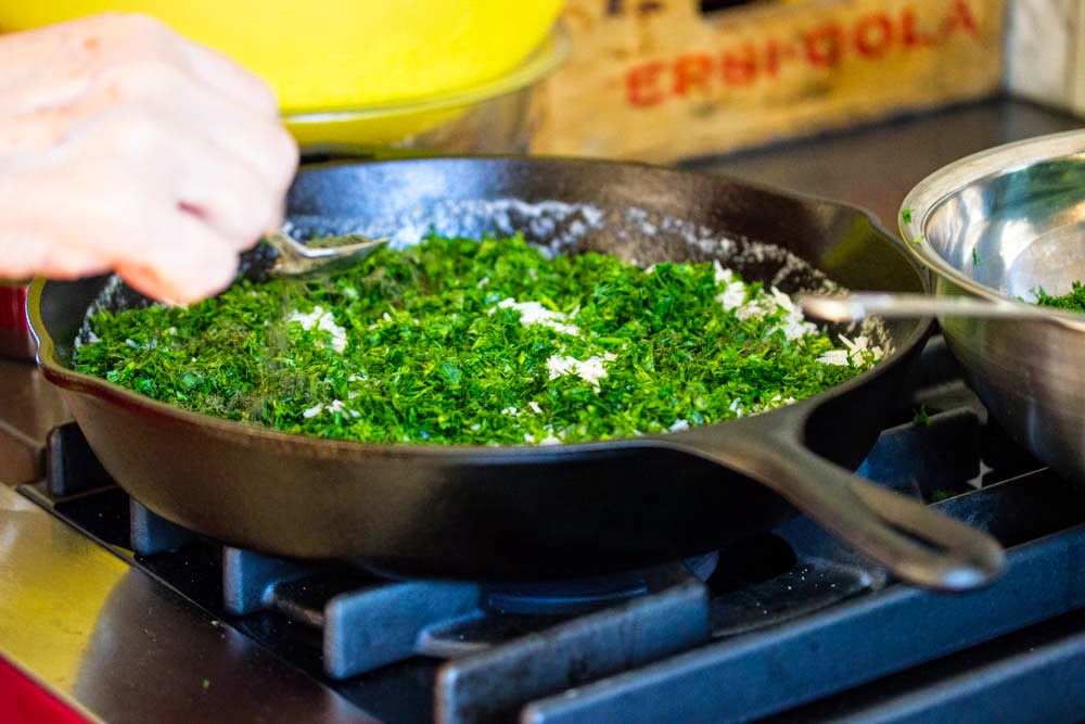 You watch the butter melt, as she sprinkles the saffron.  She scatters the rice over the bottom of the pot.  The tahdig layer.  She sets aside a cup full of freshly chopped herbs and scatters the rest – parsley, cilantro, fresh dill, chives, fenugreek – over the rice.  And then some dried dill.