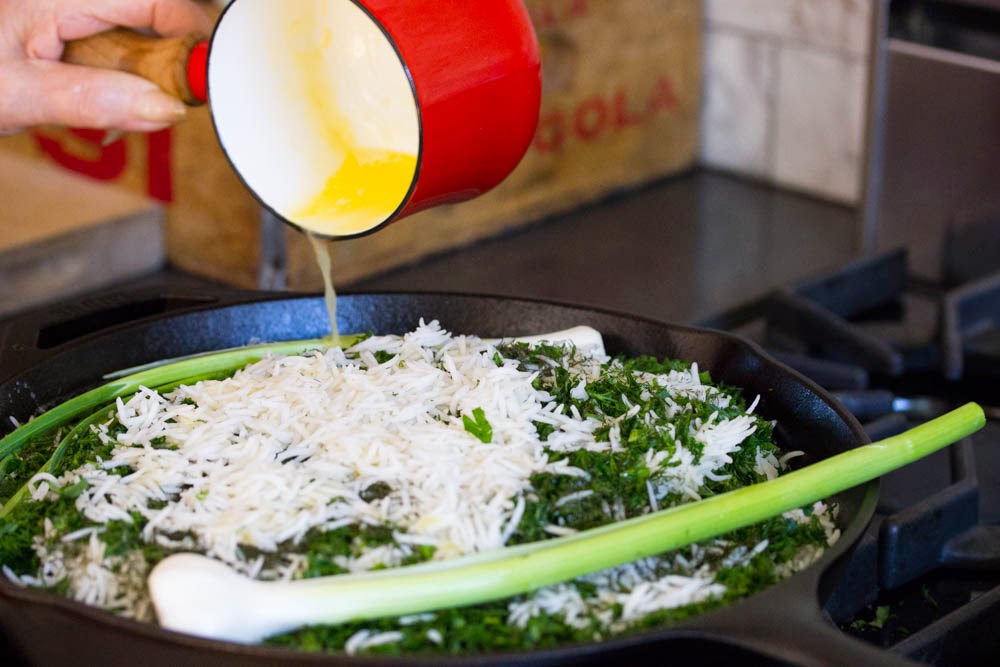 3- In a large (not stainless steel) pot or a 12″ cast iron pan (see notes) melt 2 1/2 tablespoons butter or ghee over low heat.  Make sure the melted butter covers the entire surface of your pot and along the sides.  If not add more butter accordingly.  Add a pinch of saffron to the oil and swirl around.  With a spatula add enough rice to fully cover the bottom of the pot. Using the back of the spatula or the back of a wooden spoon pack down the rice firmly. Add a layer of the larger batch of chopped herbs.  Sprinkle 1 tsp of dried dill over the fresh herbs.  Repeat, alternating layers of rice, herbs, and dried dill.  Your top layer should be a rice layer.  Place the spring garlic on top, to the side of the pot.  Pour the melted butter and 2 tablespoons hot water over the rice. Using the handle of a wooden spoon poke a couple of holes in the rice to allow the steam to escape.  Cover and turn up the heat to medium/high.  Cook for 10 minutes.  (Don’t go anywhere!  The tahdig can burn very quickly)