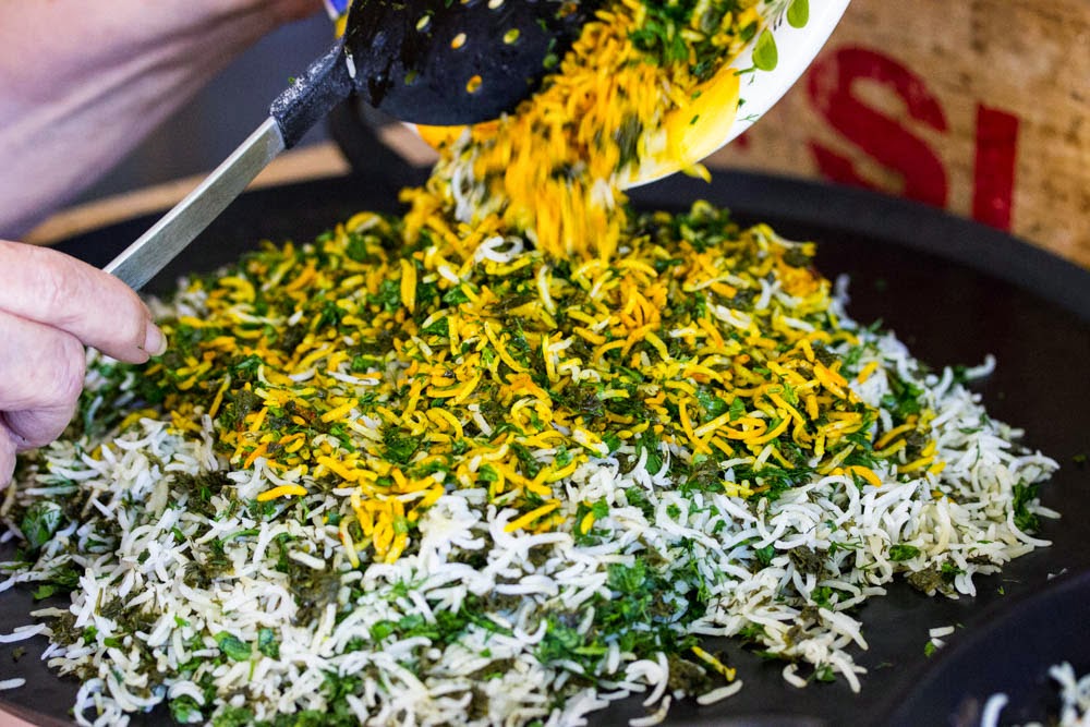 You set the platter right next to her.  She makes room for you.  But you ask her to serve the sabzi polo.  Somehow, it always tastes better if she serves it.  You watch as she delicately scatters the rice across the platter, followed by a layer of the fresh herbs she had set aside.  Scatter the rice, scatter the fresh herbs, repeat, and top with golden saffron rice.