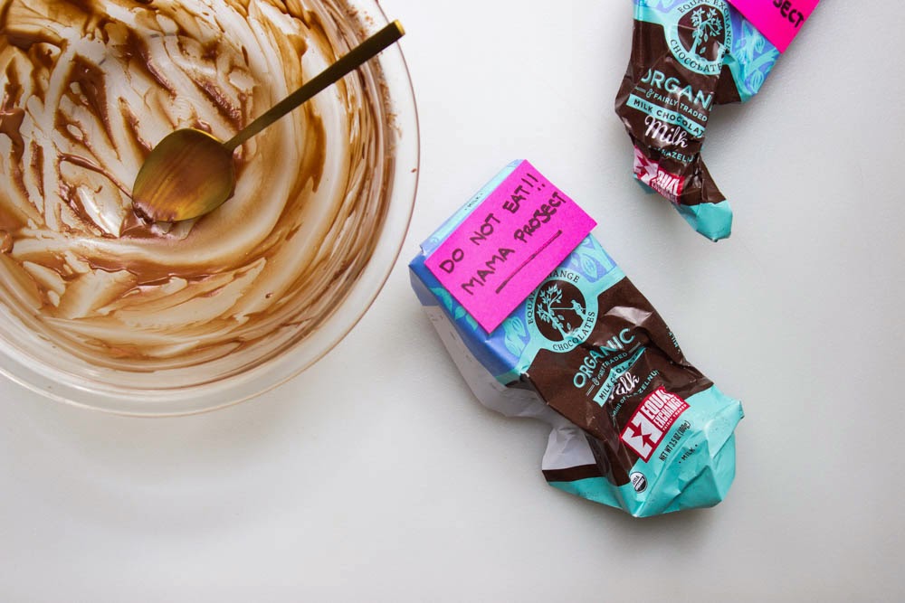 1- Melt the chocolate by slowly stirring the chocolate in a double boiler over barely simmering water. (If you don’t have a double boiler use a large, heat proof bowl over a smaller saucepan filled with about 2 inches of barely simmering water.  Keep the heat as low as possible) Turn off the heat, but leave the double boiler in place over the still-warm burner so that the residual heat keeps the chocolate warm.
