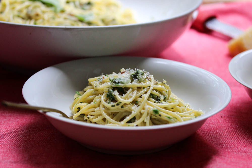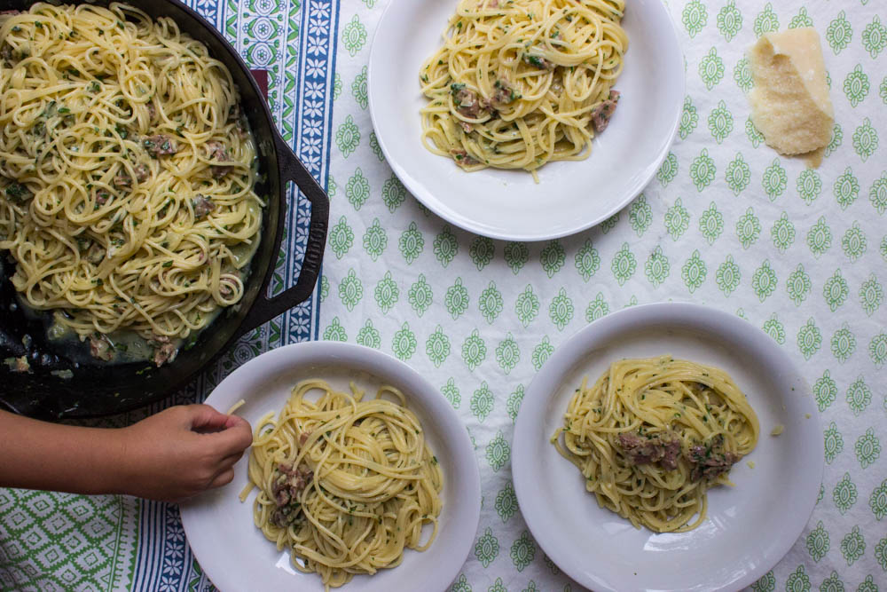 Baba’s Carbonara is the one dish that has my girls (and husband) drop whatever they’re doing and come crashing to the dining table. It is the dish that every other carbonara is compared to. It’s Hawaii in December. It’s Vancouver in July. It’s Baba and Grandma Kumi working side by side, a finely honed duet. Baba chopping the herbs, Grandma Kumi cracking the eggs. It’s the constant debate over how many eggs to use. One more she suggests, one less he insists. Passions run high. Very high. It’s everyone stepping back and giving Baba room to swiftly and expertly incorporate the raw eggs with the steaming pasta.