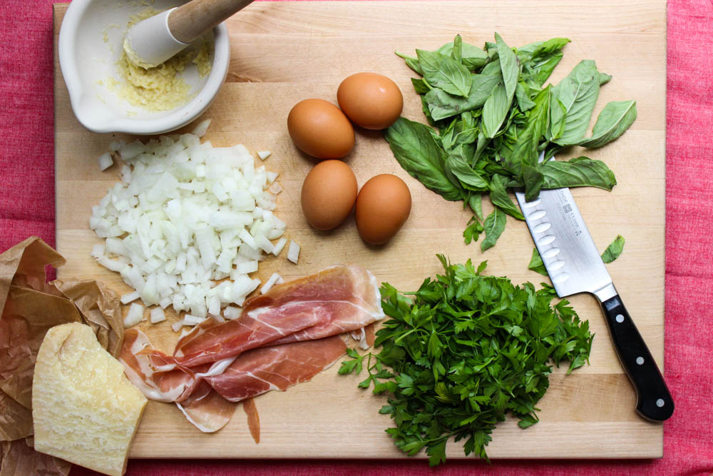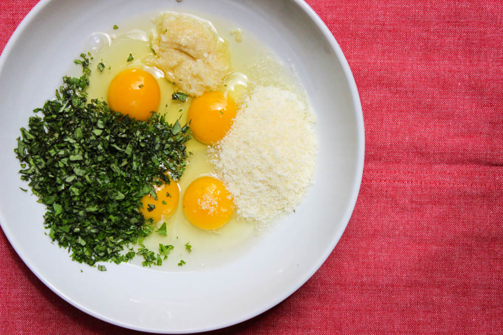 WHILE the onion cooks, in a medium sized bowl whisk the eggs and add the garlic, parsley, basil, cheese (see note above), 1/2 teaspoon sea salt, 1/4 teaspoon pepper. Mix well to fully combine. No lumps.