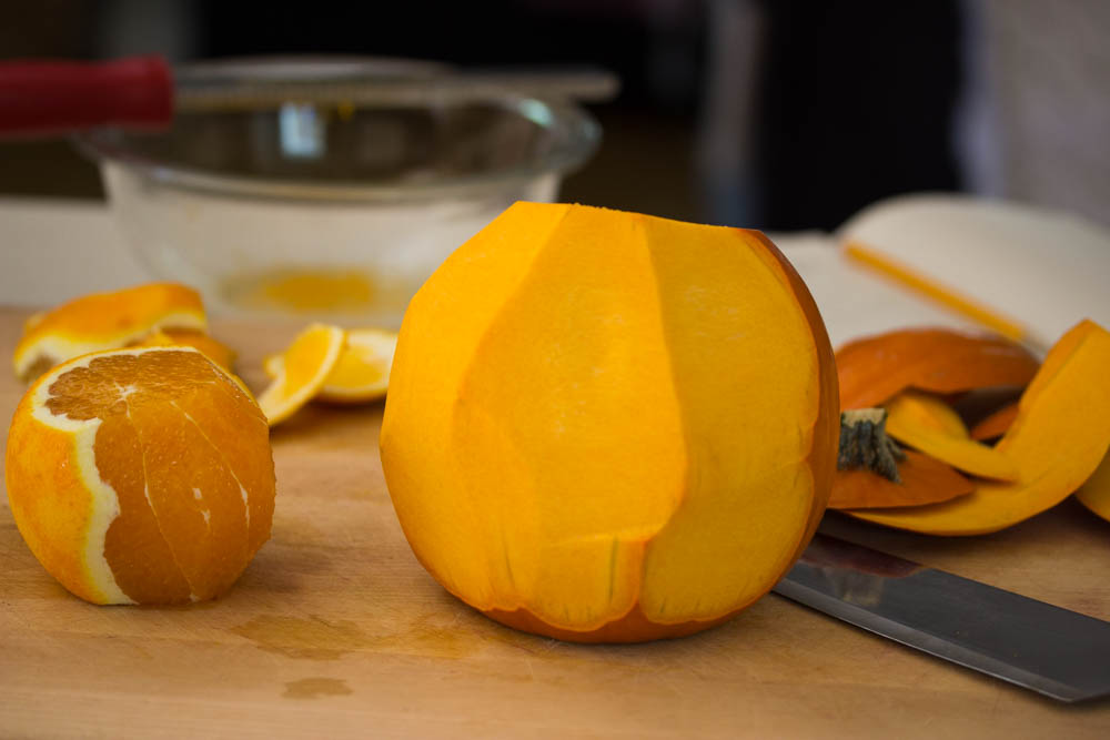 Set the pumpkin and orange on the cutting board.  Slice the tops and ends off each.  For stability, for support.  Use a sharp knife and cut downwards. Revealing the flesh. Be bold, be precise. Peel away the skin,the membrane, the rind. Let the curves of the fruit guide your way.