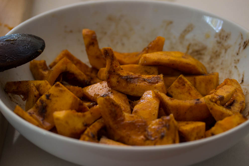 Peel the pumpkin (as you did the orange) and discard the seeds and pulp.  (You can roast the pumpkin seeds if you’re in the mood) Cut the pumpkin in 1 inch slices or chop up the pumpkin in about 1 1/2 inch cubes.  This depends on how you would like to serve it.  Place the pumpkin in a big bowl and add the ghee or olive oil, the maple syrup and vanilla.  Stir to combine.  In a small bowl combine the salt and all the spices.  Sprinkle over the pumpkin, stir to combine.  Transfer the pumpkin to the baking sheet and roast for 20 minutes.  Tossing once halfway through.