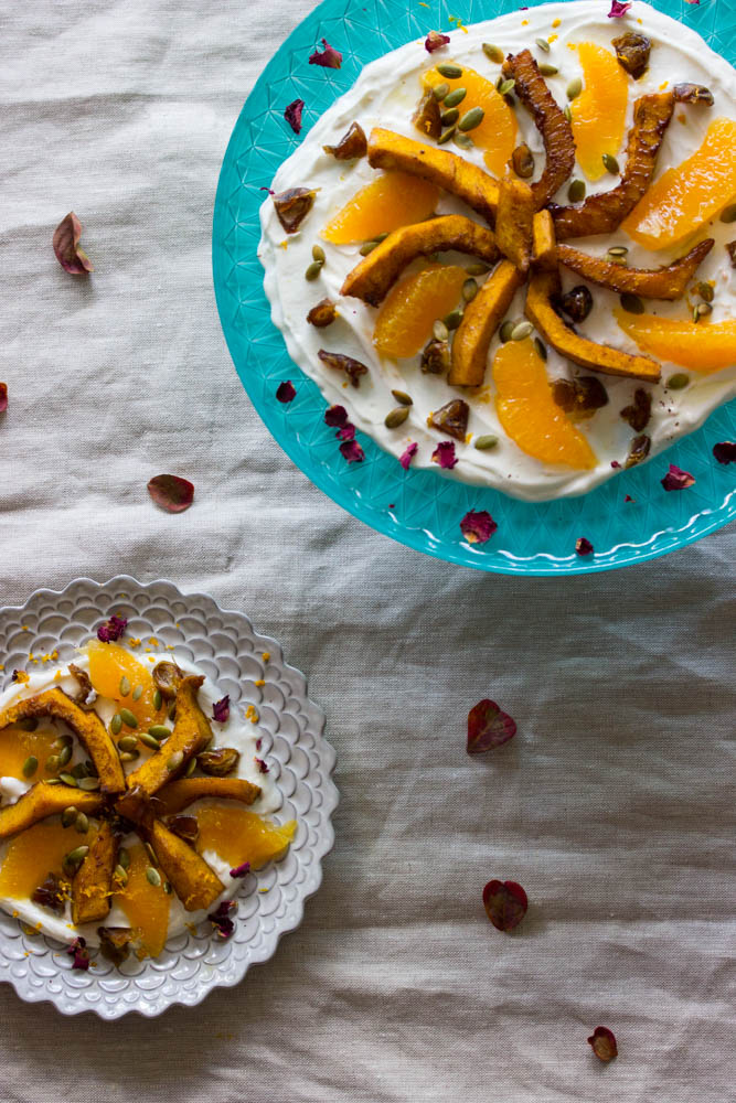 I’ve really been enjoying this borani for breakfast.  But, it also makes a great side dish accompanying any meal.  I think it would be particularly festive at a Thanksgiving table.  I’ve layered the roasted pumpkin and orange segments over the yogurt in the photos, which makes for a pretty presentation.  But feel free to chop up the pumpkin in about 1 1/2 inch cubes and mix everything up with the yogurt.  Here’s a great guide to segmenting citrus.  I also prefer this borani as is, but if you would prefer it more sweet go ahead and drizzle with extra maple syrup when serving. Just keep in mind the dates sweeten things up quite a bit.  This is a great “transitional” dish.  When we say goodbye to summer and welcome fall.  Or in our case in Los Angeles when we’d like to pretend to do so.