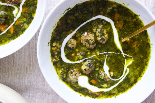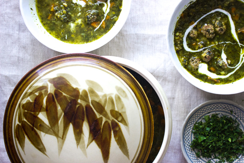 The true spirit of aash-making is not in how accurately you measure, or use these ingredients exactly as dictated. Aash is generous in spirit and very forgiving. If you don’t have mung beans on hand try lentils, or substitute rice or noodles for the farro. For a vegetarian option, leave out the meatballs. Don’t get too caught up on how big or small your bundle of greens is. Reach deep in the back crevices of your fridge and revive the forgotten and neglected. This is also a great dish to use the whey (from straining yogurt) sitting in your fridge door, politely waiting for its turn to be asked to the dance. If you don’t have whey, not a problem, just use water.This recipe can serve as a guide as your pantry, crisper and taste buds lead the way. From east, south, north and west.
